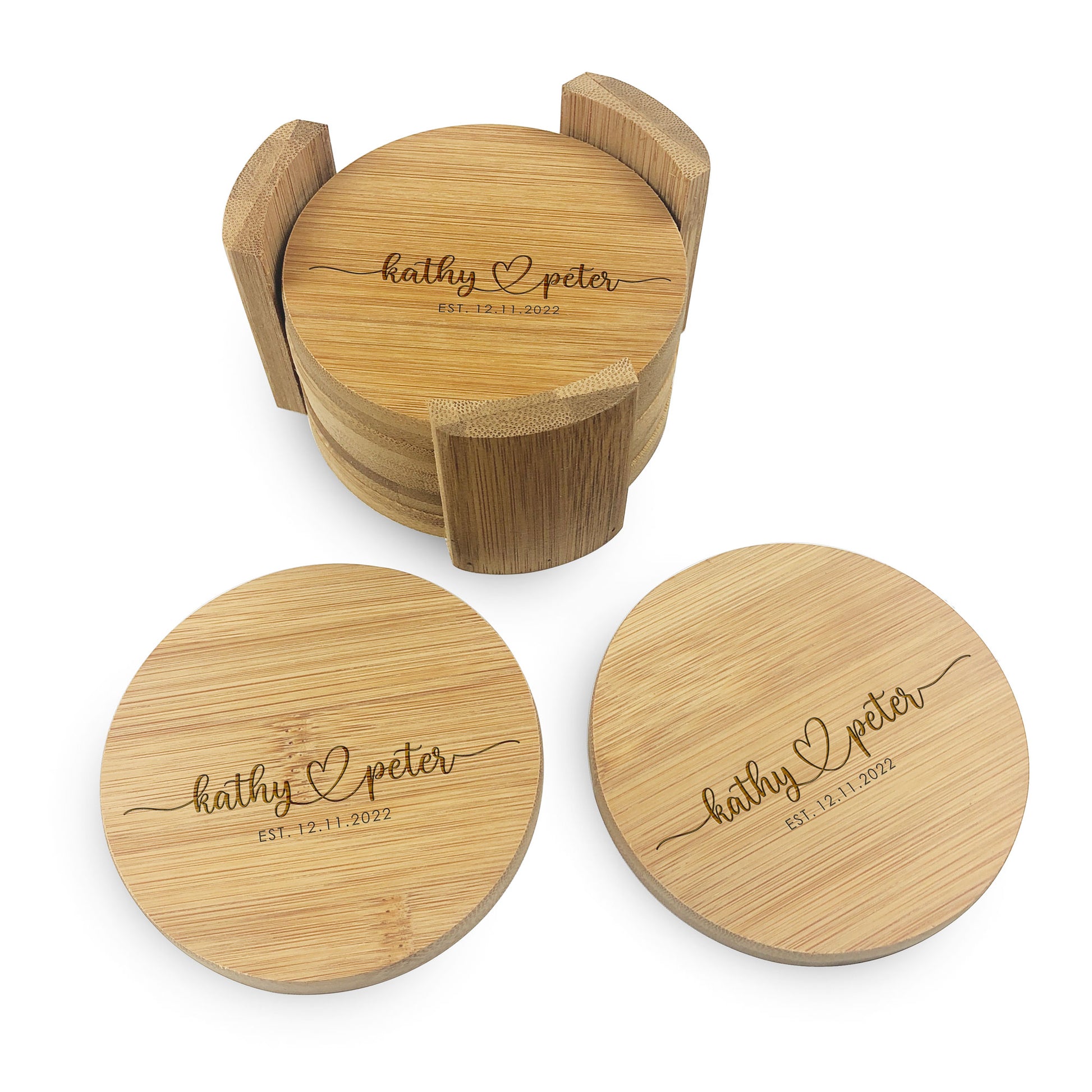 6 x Personalised Engaved Round Bamboo Coaster Set Gift with Stand | Custom Names Date