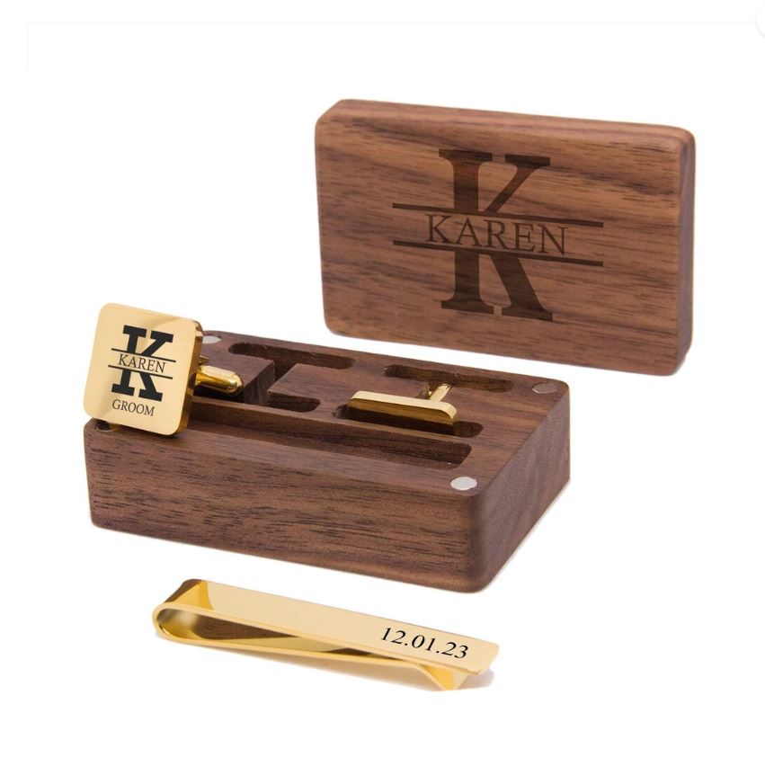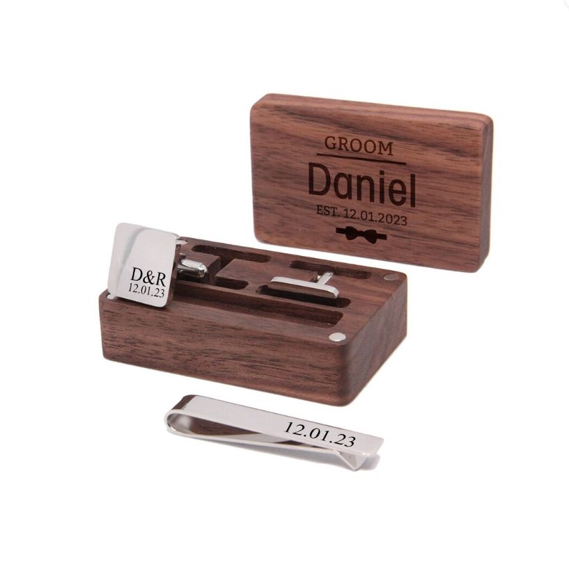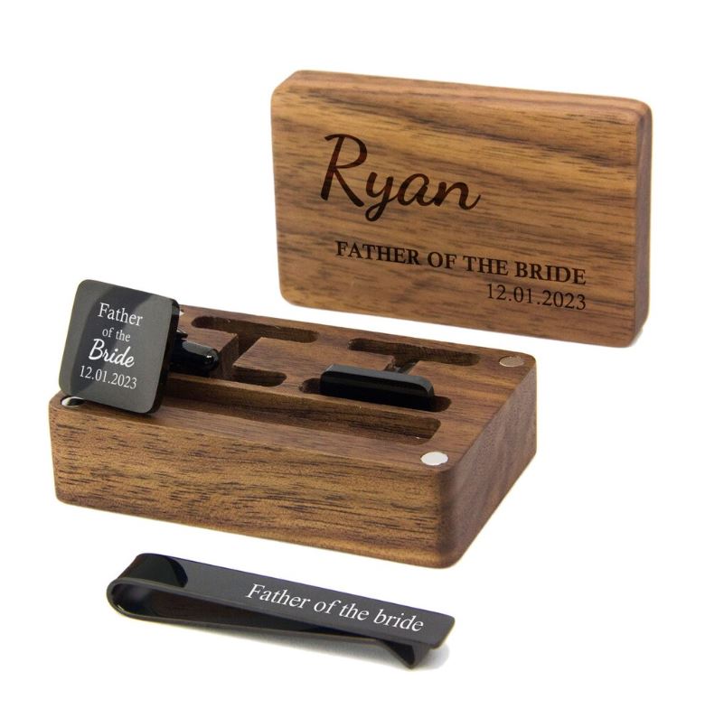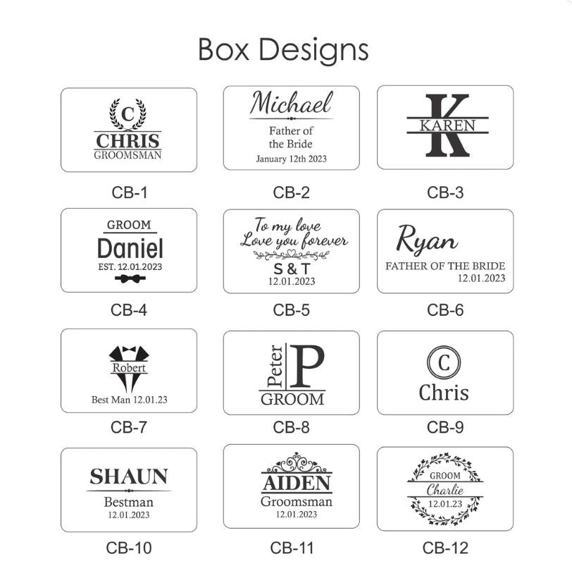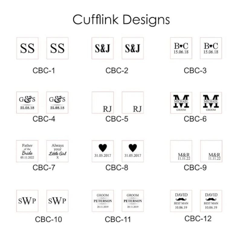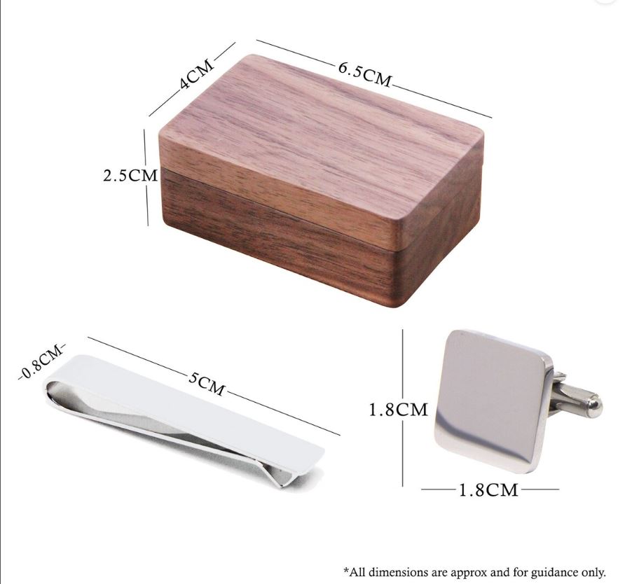These personalised wedding Square cufflinks, Tie Pin & Box Set make a great accessory to any outfit and are great for a unique formal look. The cufflinks, Tie Pin and Box can be personalised for Best man, Ushers, Father of the Bride, Father of the Groom or for any other of the wedding, party, special occasion. Each box is individually unique and they all have their own markings. Please note that colours will vary from box to box.