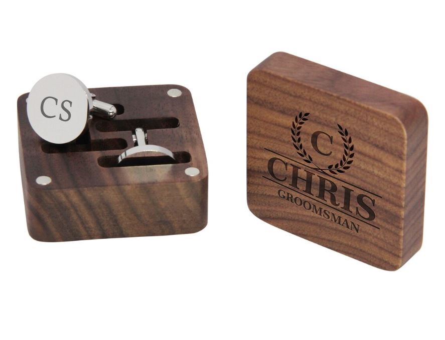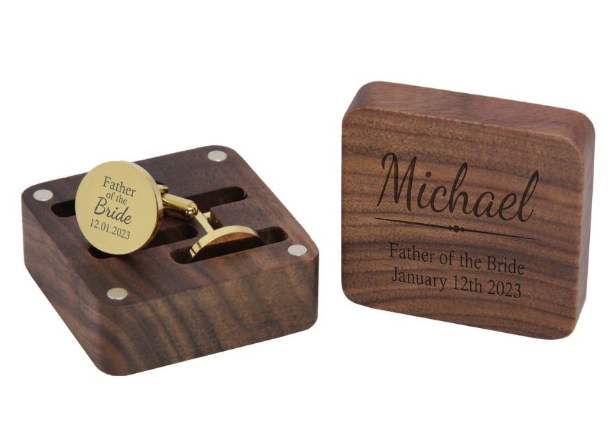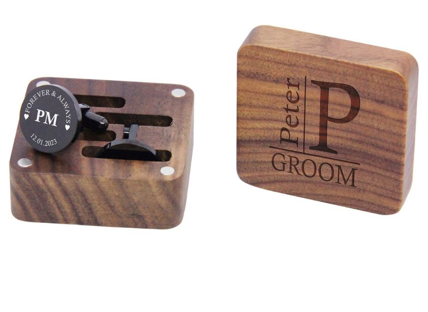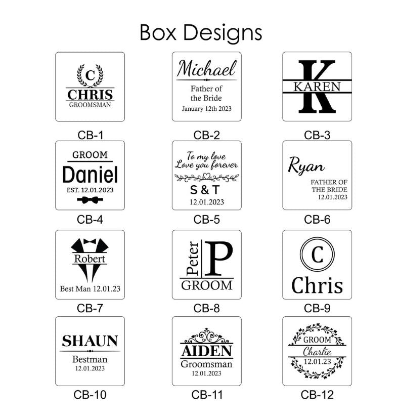 These personalised wedding Round cufflinks & Box Set make a great accessory to any outfit and are great for a unique formal look. The cufflinks and Box can be personalised for Best man, Ushers, Father of the Bride, Father of the Groom or for any other of the wedding, party, special occasion. Each box is individually unique and they all have their own markings. Please note that colours will vary from box to box.