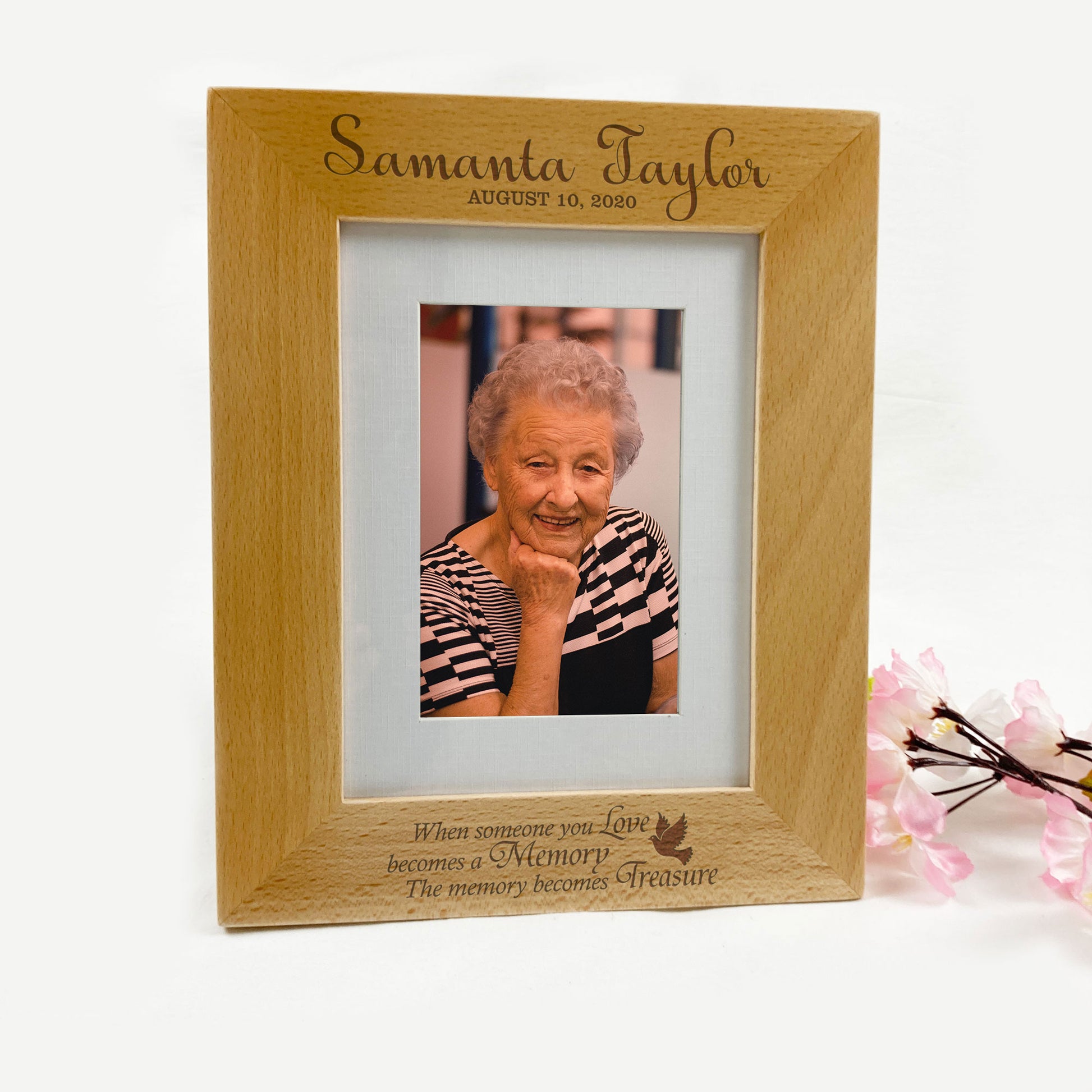This personalised wooden photo frame is a wonderful memorial gift to keep your loved one close. These frames are custom engraved with the name and details.