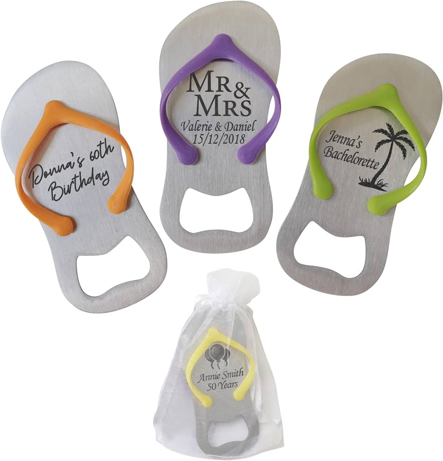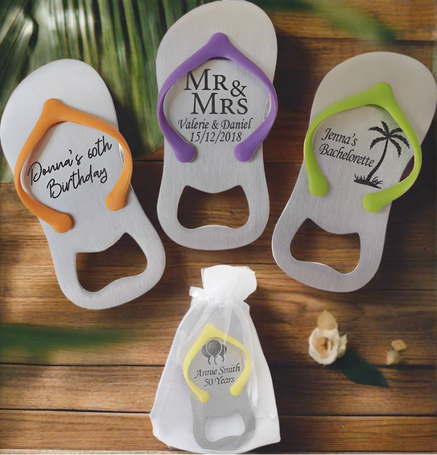 Add a name, a memorable occasion, or a lighthearted phrase to make your flip-flop bottle opener unique and add a whimsical touch to any event. Its robust construction guarantees longevity, and the etched accents turn it into a thoughtful gift or treasured memento.