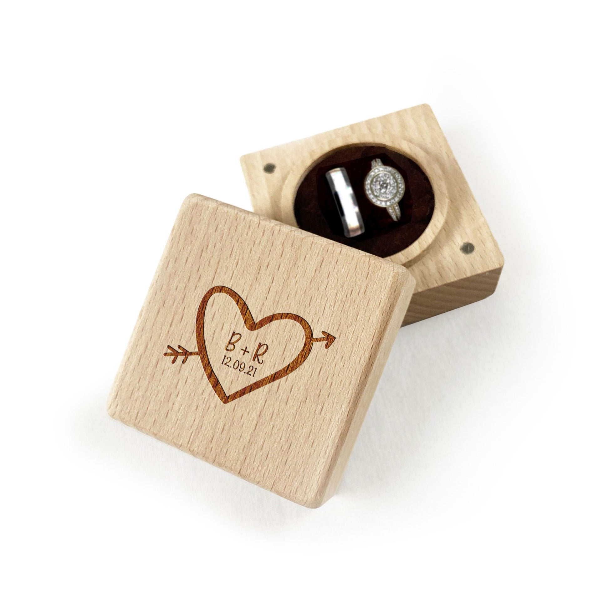 These beautiful wooden square boxes are custom engraved to order. Add a personalised touch, to your special celebration with one of our Custom Ring Boxes. A velvet topped foam insert for 1 or 2 rings included.