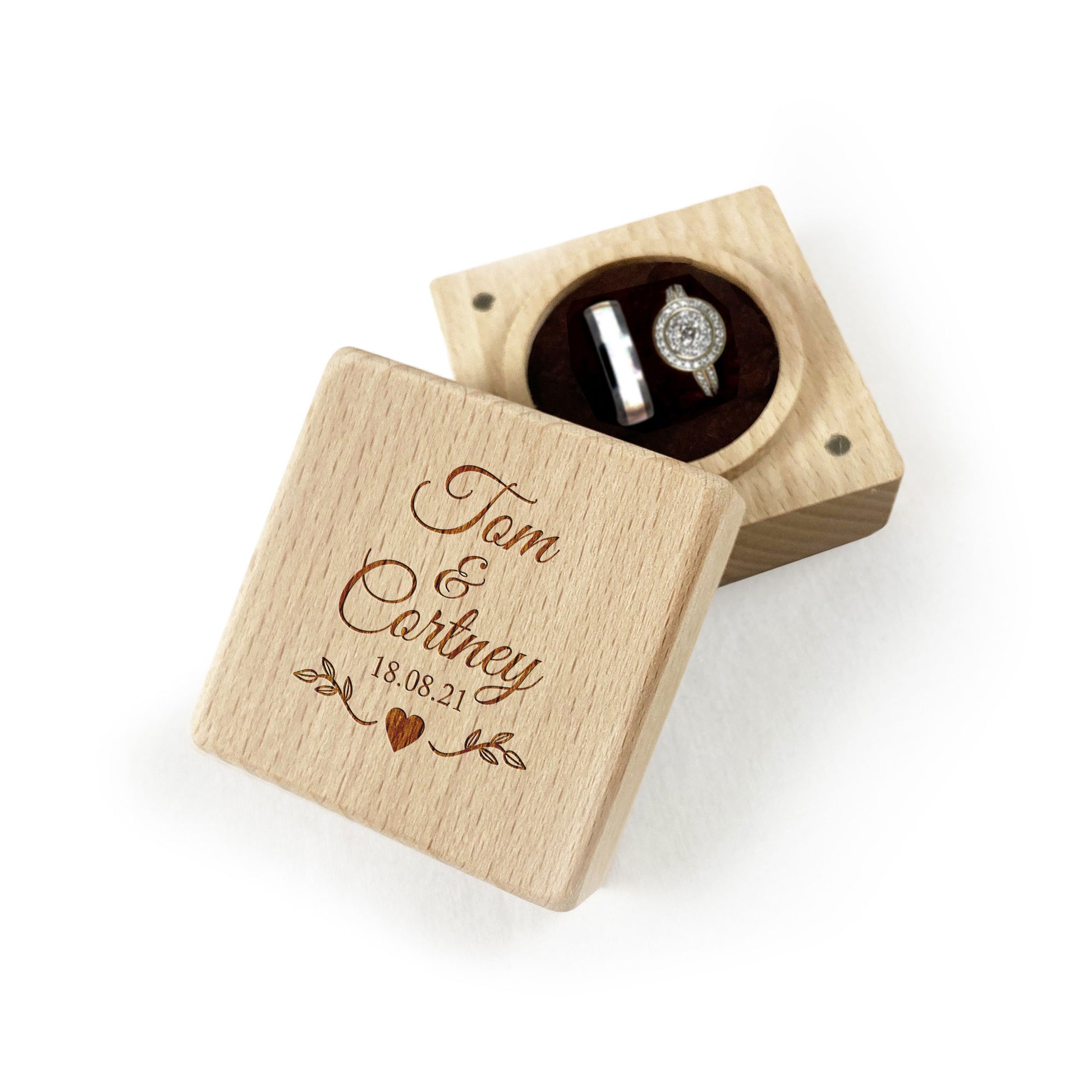 These beautiful wooden square boxes are custom engraved to order. Add a personalised touch, to your special celebration with one of our Custom Ring Boxes. A velvet topped foam insert for 1 or 2 rings included.
