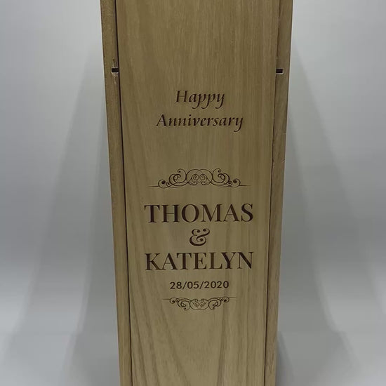 Our personalised wooden wine boxes make a perfect gift and keepsake for any wedding, anniversary, house warming, and more. The box fits regular 750ml champagne and wine bottles. Each box can be personalised with one of our unique designs or even your very own custom design!