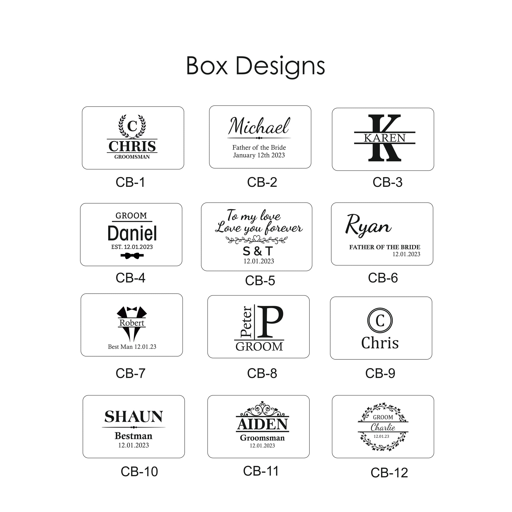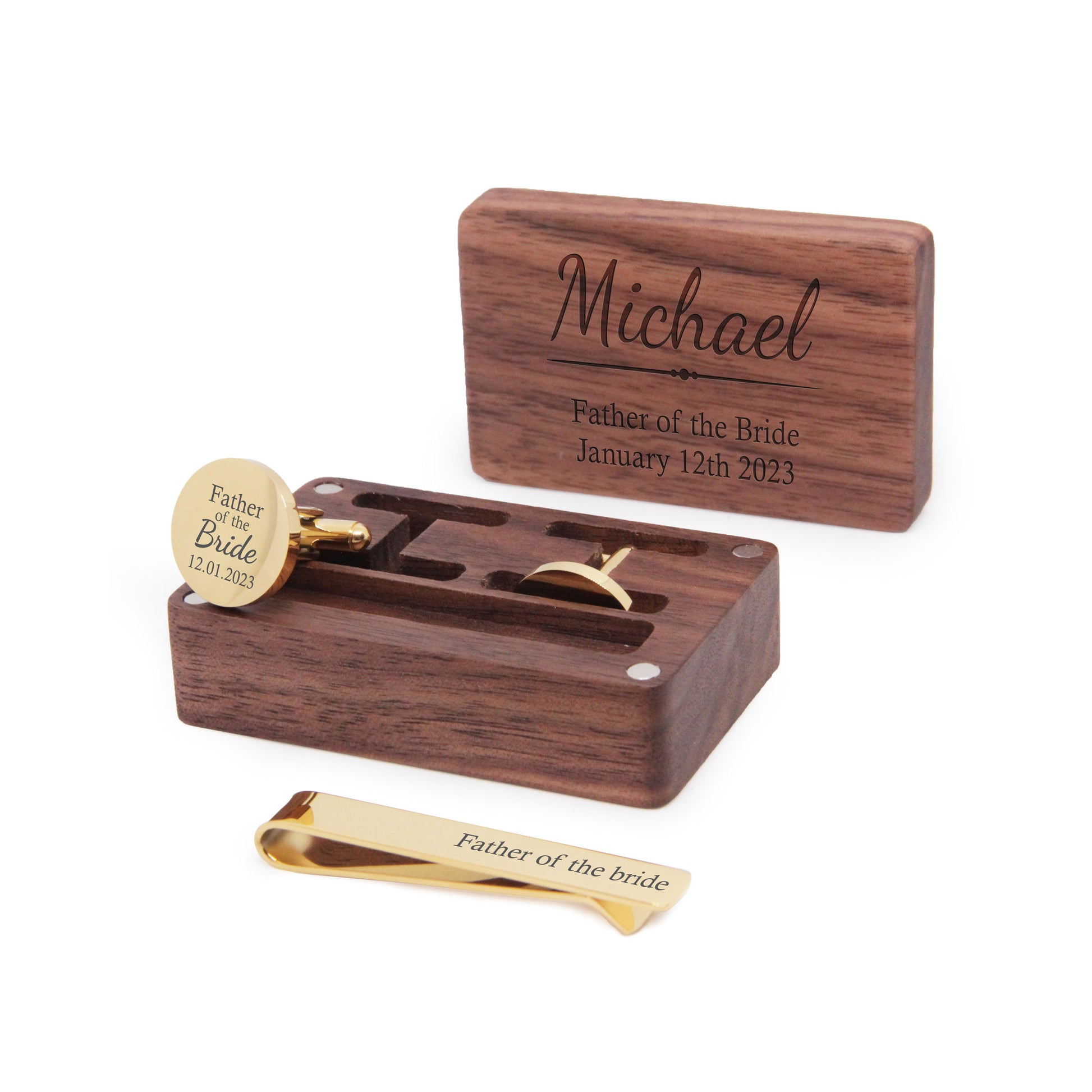 These personalised wedding Round cufflinks, Tie Pin & Box Set make a great accessory to any outfit and are great for a unique formal look. The cufflinks, Tie Pin and Box can be personalised for Best man, Ushers, Father of the Bride, Father of the Groom or for any other of the wedding, party, special occasion. Each box is individually unique and they all have their own markings. Please note that colours will vary from box to box.