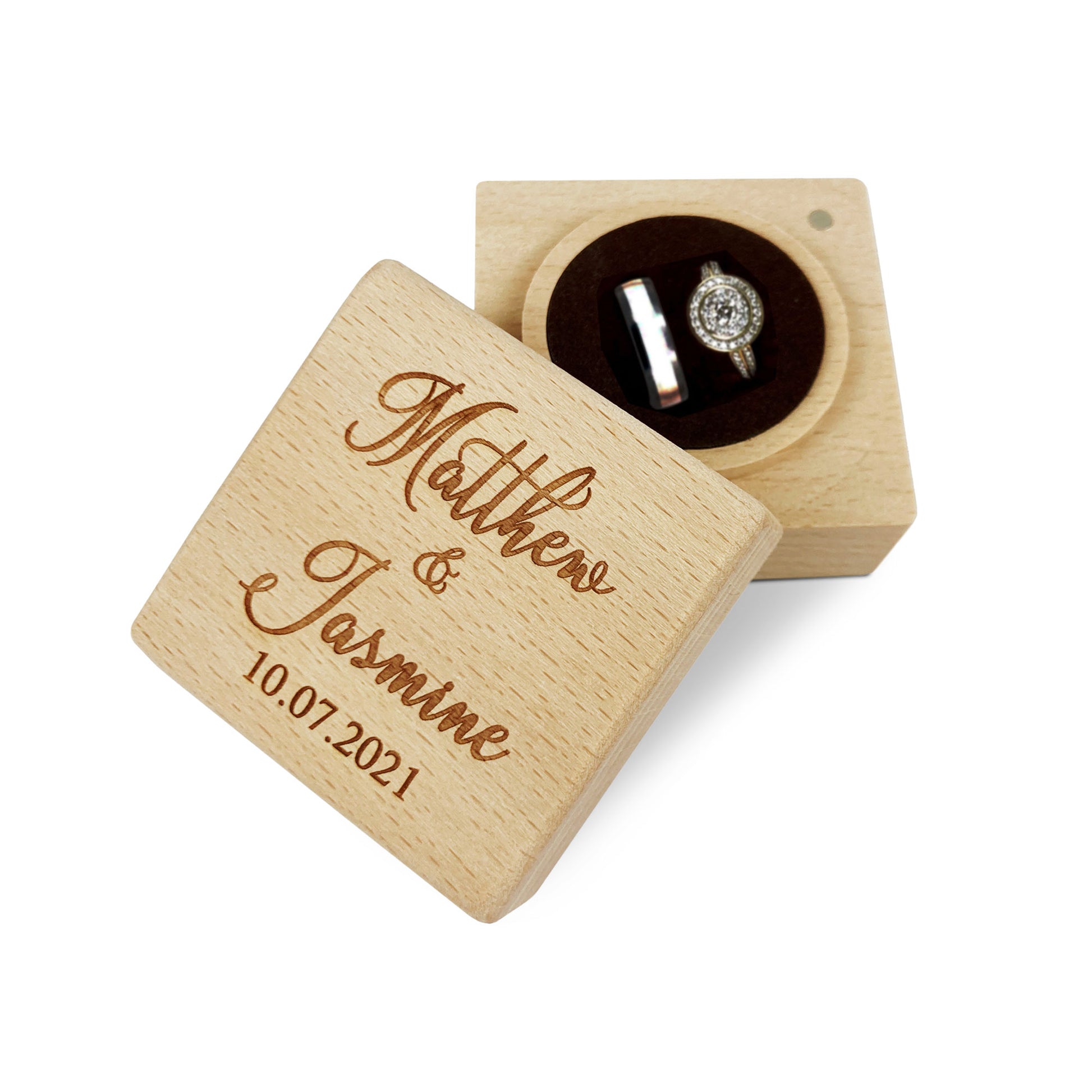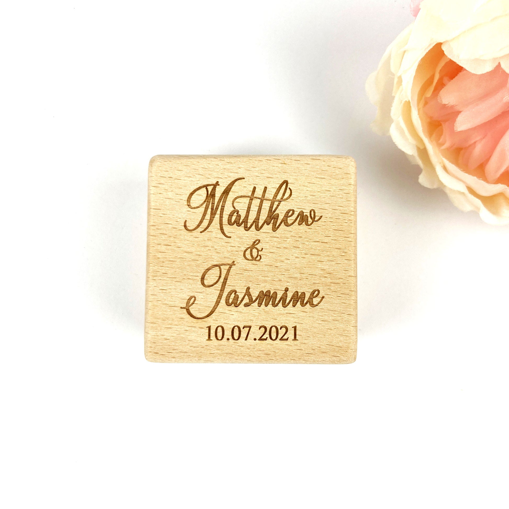 These beautiful wooden square boxes are custom engraved to order. Add a personalised touch, to your special celebration with one of our Custom Ring Boxes. A velvet topped foam insert for 1 or 2 rings included.