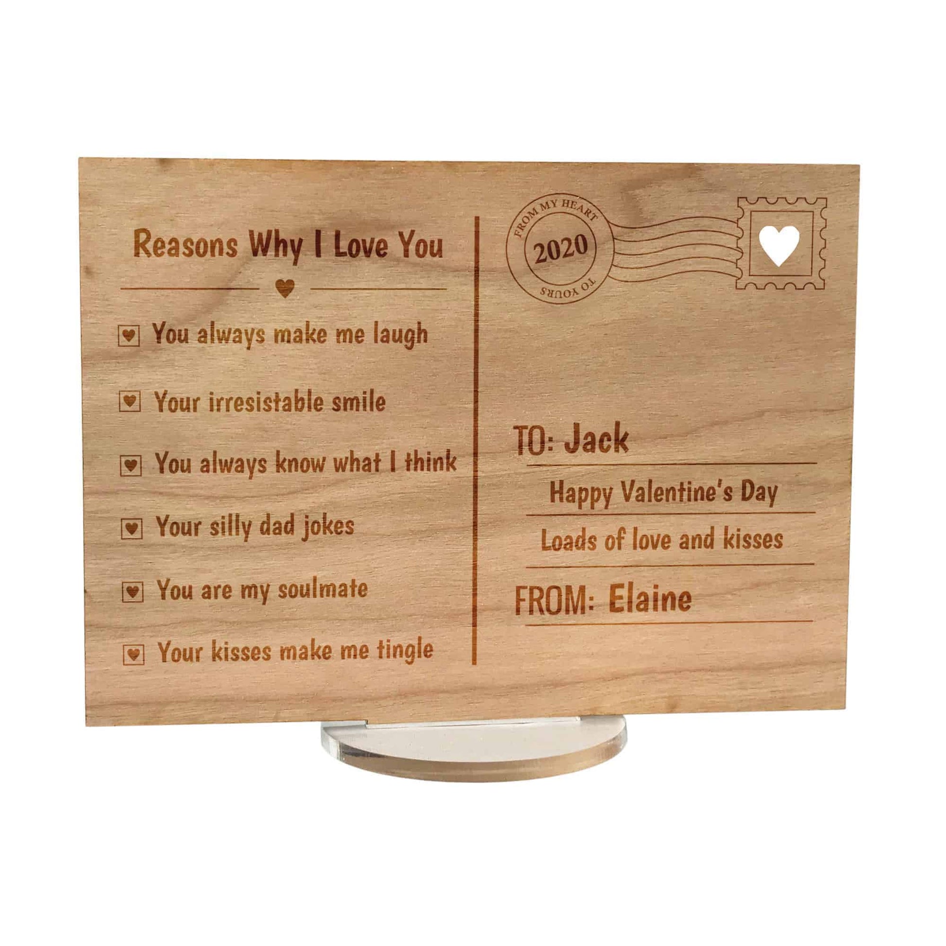 Wooden Engraved Reasons Why I Love You Valentines Day postcard Gift with stand