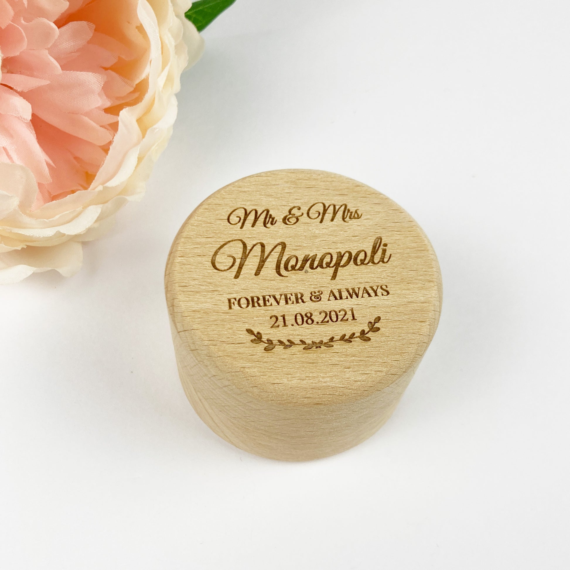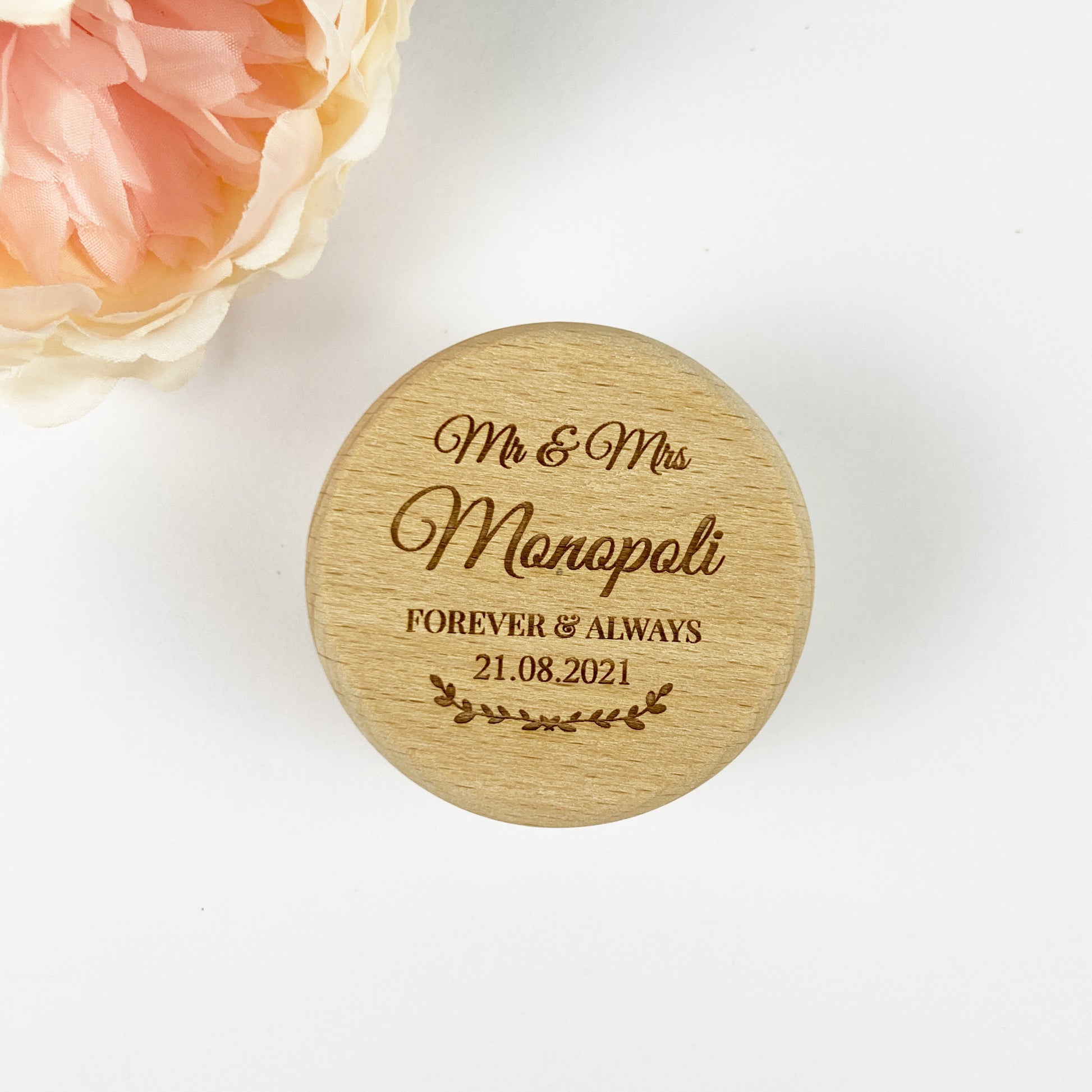 Round Wooden Engraved Mr. & Mrs. Forever Always Ring Holder Gift Box