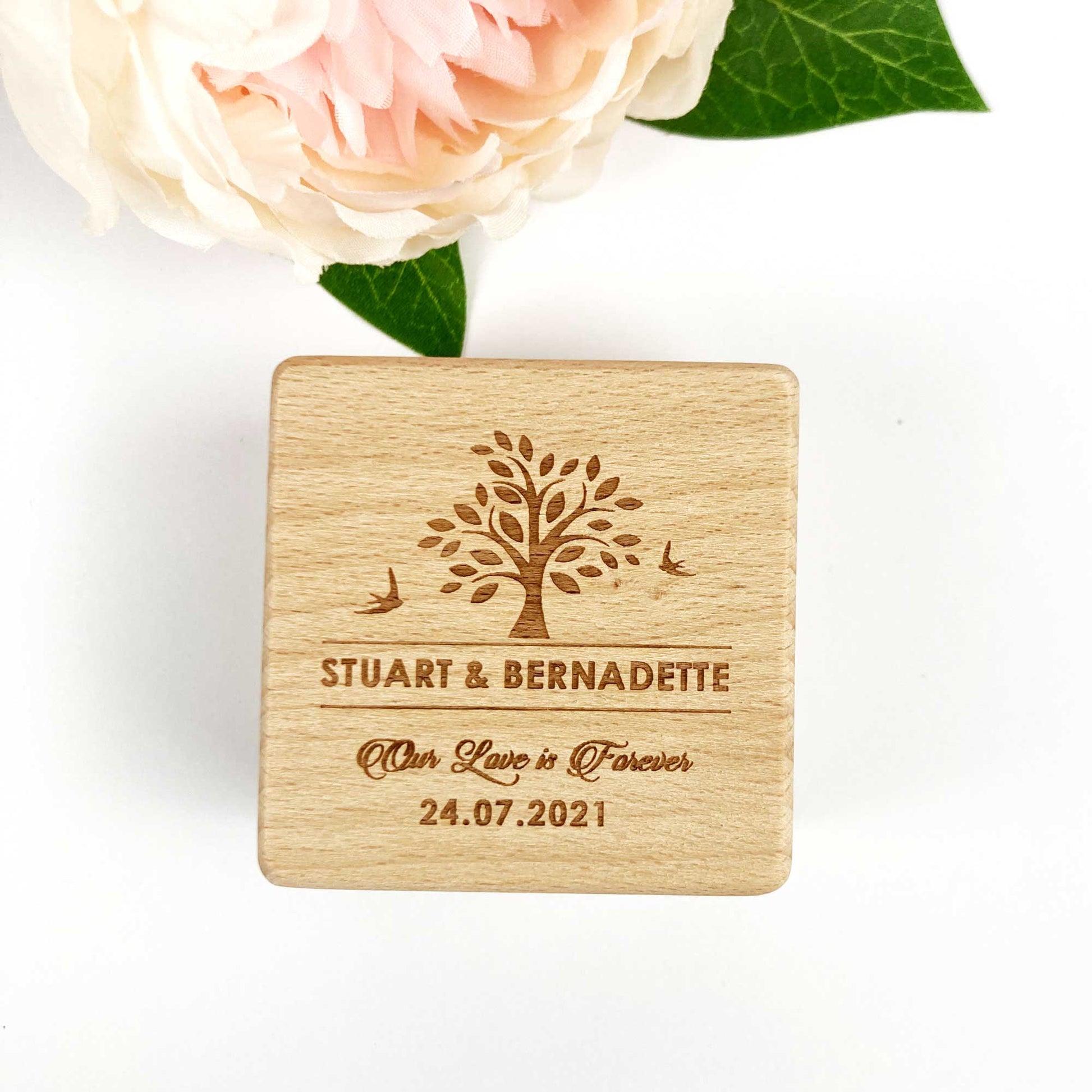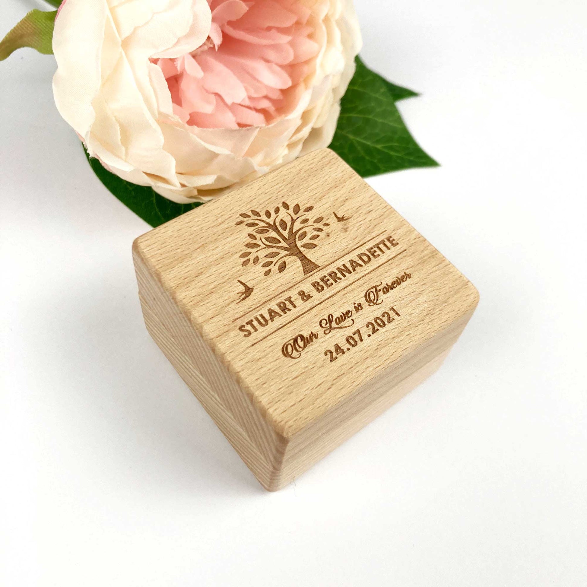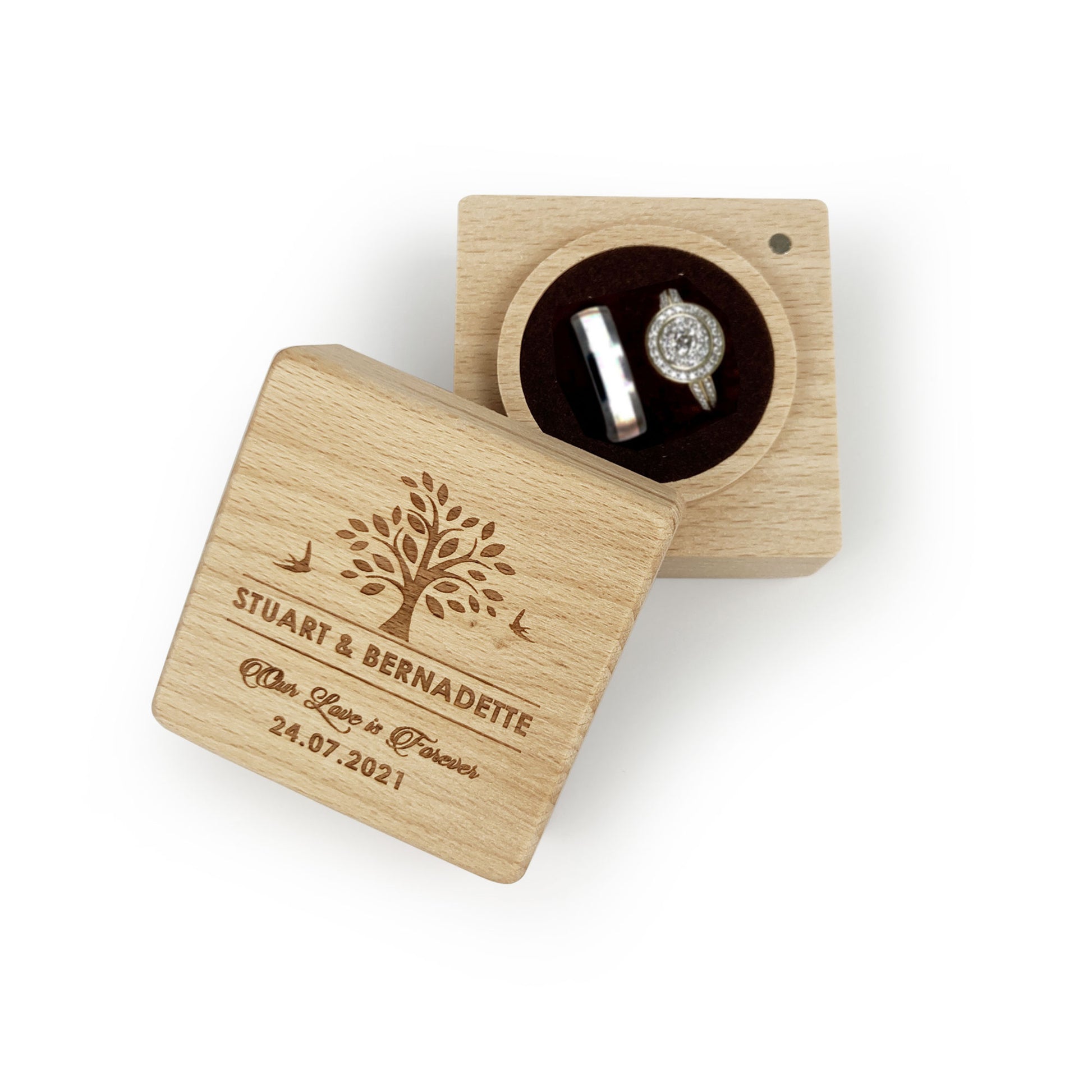 These beautiful wooden square boxes are custom engraved to order. Add a personalised touch, to your special celebration with one of our Custom Ring Boxes. A velvet topped foam insert for 1 or 2 rings included as per your selection